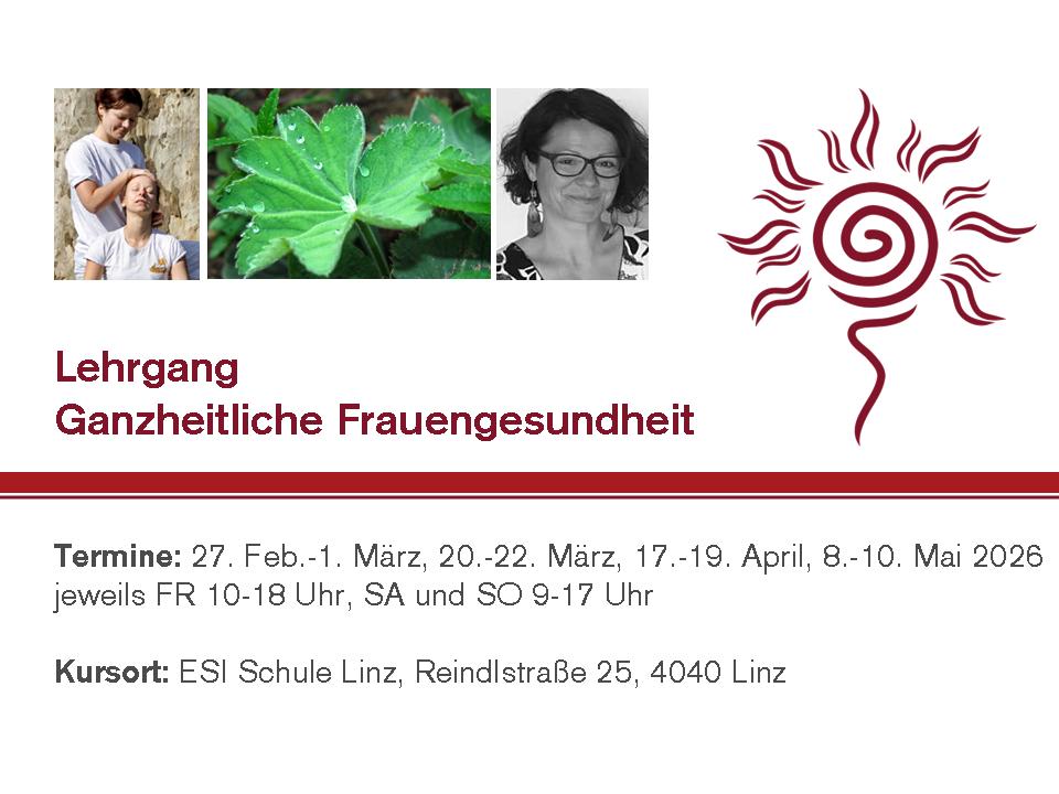In jedem der einzelnen Wochenenden werden spezifische Frauenthemen jeweils ganzheitlich beleuchtet: Neben der westlichen medizinischen Sicht lernen wir Zugänge der TCM, der heimischen Volksheilkunde sowie psychologische und energetische Zusammenhänge kennen.